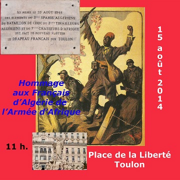 Bien que des cérémonies officielles, tout le long de la méditerranée, commémorent le courage des participants au débarquement, nous déposerons nous, de façon très modeste, une gerbe Place de la Liberté à Toulon, en hommage à ceux dont les personnalités politiques ne parlent pas. Ceux dont on veut même gommer le rôle majeur dans la liberté retrouvée de la France, je veux parler des Pieds-Noirs, Français d’Algérie, qui ont su répondre à l’appel désespéré d’une France dans la peine.