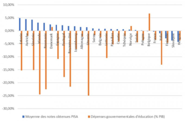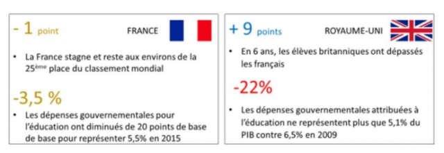 Ceci dans le but de privilégier un domaine clé. Pourtant, en matière d’éducation il n’y a pas de lien majeur entre dépenses publiques et réussite scolaire, comme le montrent les études PISA réalisée dans 75 pays et auprès de 540 000 élèves. Qu’il semble difficile de changer les vieux réflexes français !