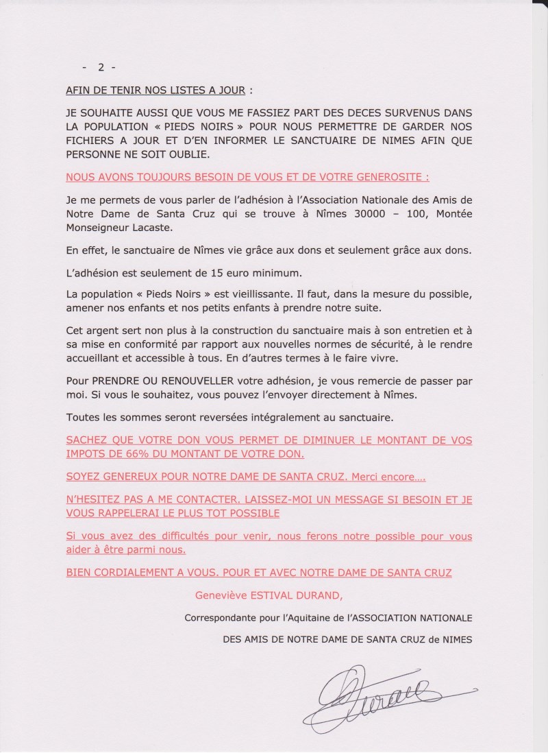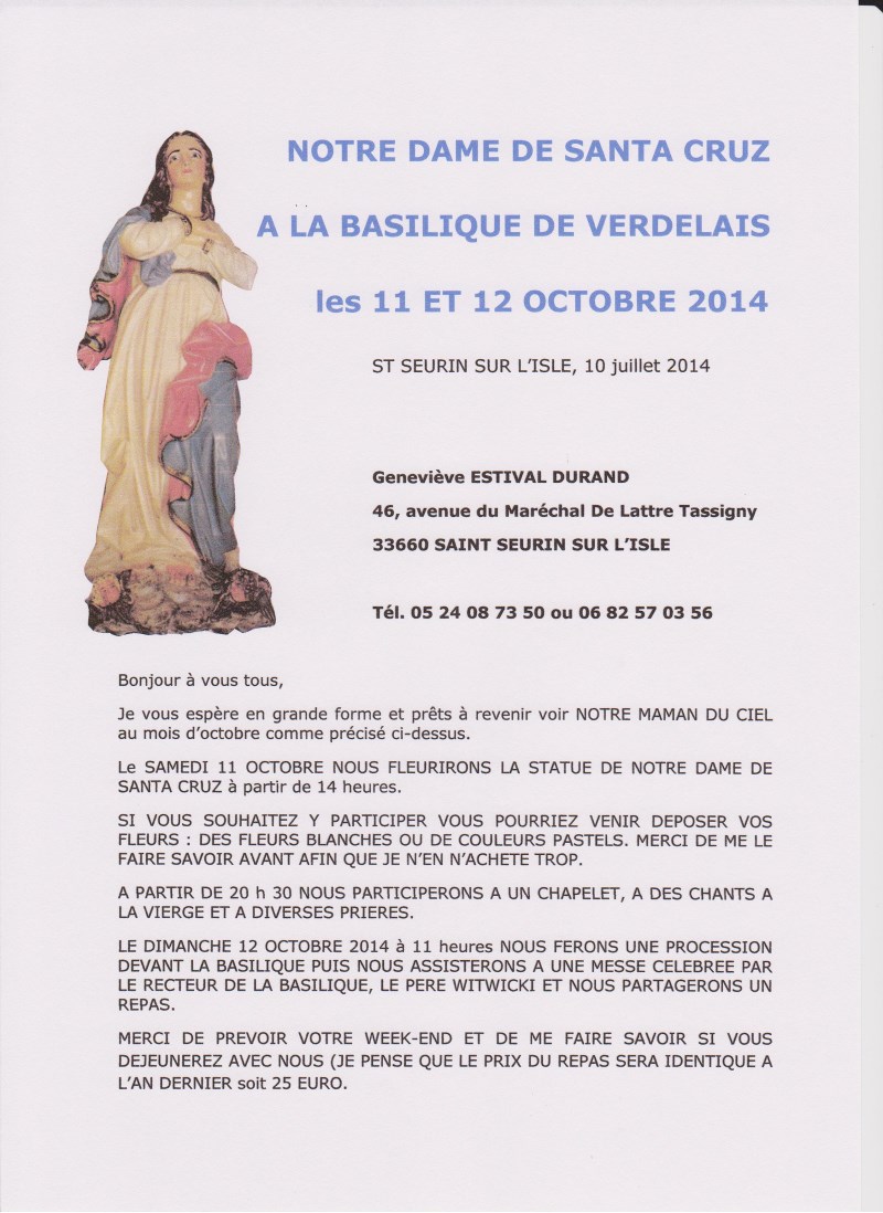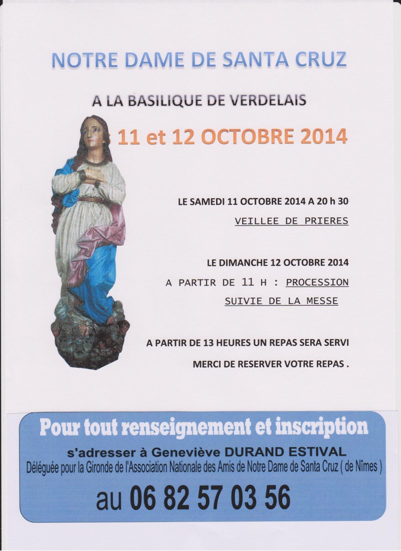 Madame Geneviève Durand-Estival, correspondante pour l’Aquitaine de l’Association Nationale des Amis de Notre Dame de Santa Cruz nous informe que le samedi 11 octobre 2014 et le dimanche 12, Notre Dame de Santa Cruz sera à VERDELAIS en Gironde (à 5 kms de Langon)