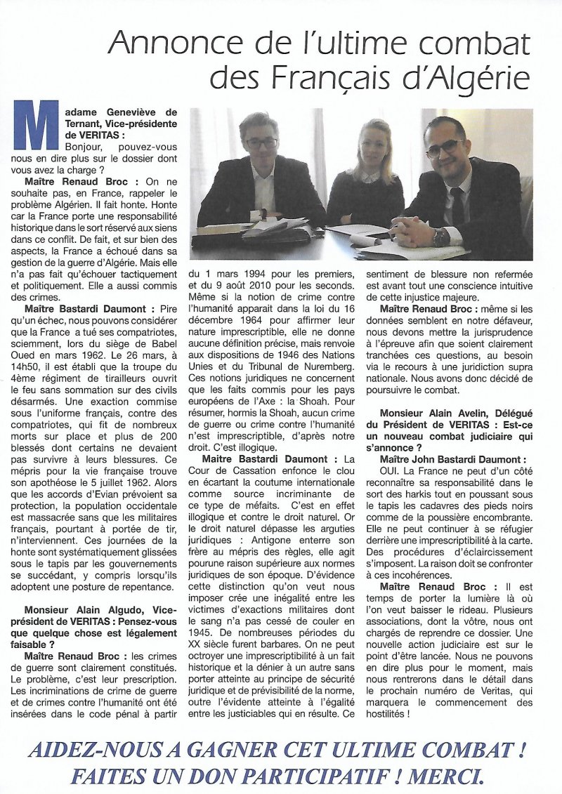 Dans sa dernière revue n° 188, VERITAS, qui a trouvé deux bons Avocats motivés, annonce l’éminence d’une nouvelle action judiciaire à laquelle nous devrons nous associer.