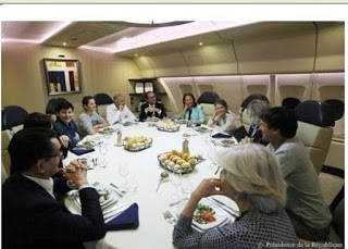 (photo ci-dessous : au fond de l’image, dans la salle à manger de l’avion présidentiel, en bleu ciel, Ségolène à la gauche de Président)