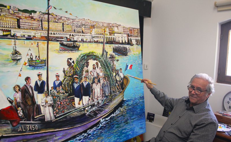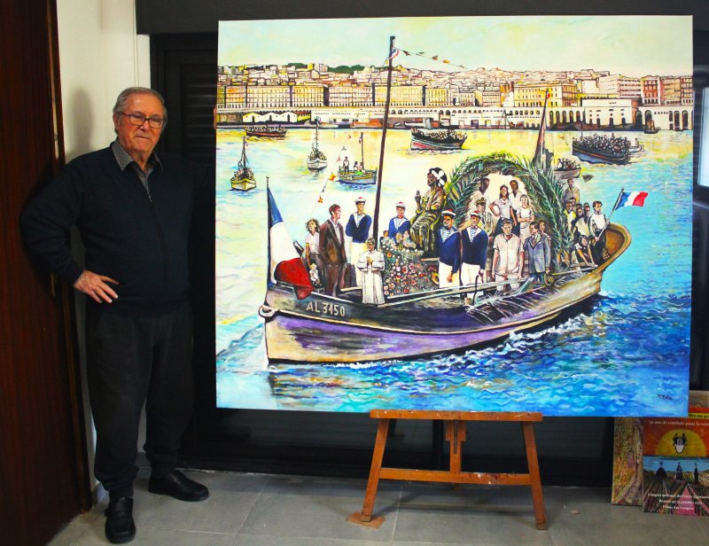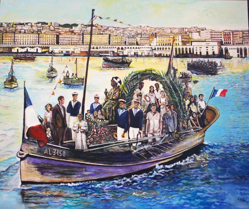 Il s’agit d’une acrylique sur toile de grandes dimensions (2m sur 2m) représentant une scène de cette fête populaire maritime de la « Saint Pierre » qui se déroulait à Alger à la fin juin de chaque année et pour laquelle la ferveur ne s’est jamais démentie, tant auprès des Catholiques que les musulmans, tous séduits par la beauté du spectacle (Tout gamin, j’en ai été le témoin, car mon père, Pierre, comme le Saint, trésorier de la société de Saint Vincent de Paul, m’y amenait).