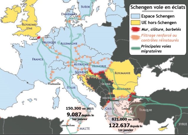 Caramba, les chiffres commencent à donner le tournis y compris chez ceux qui en France ou ailleurs entonnaient il y a encore 6 mois : " Pour nous l’accueil, c’est oui " ou " Welcome Refugees ". Et oui, 2 millions de déshérités, y a de quoi paniquer. Et ça panique, faute d’avoir su anticiper et réagir à temps. Un peu partout, des murs se dressent pour tenter de faire barrage à la vague. Tous les pays Schengen, les uns après les autres remettent en place les contrôles aux frontières ou mieux les ferment. On voit la Belgique expulser 619 migrants arrivés de Calais vers... la France, L’Allemagne qui en rejette 6 000 en Autriche. La Suède passe de 10 000 droits d’asile accordés par semaine en 2015 à 700 cette année et refoule ses trop-pleins vers le Danemark qui lui refoule à son tour vers l’Allemagne. Des policiers macédoniens entrent en Grèce pour repousser des migrants. La Grèce appelle au secours et Lampedusa n’en finit plus de déborder. Partout des incidents, plus ou moins graves, éclatent entre migrants et autochtones. C’est un bordel inextricable ! Et oui, ça panique sévère parce que ce qui est entrain de se jouer, parallèlement à cette invasion, c’est ni plus ni ni moins que l’explosion des accords de Schengen ; à terme, proche, la fin de la zone de libre échange ! Et au bout du bout, le risque plus grand que jamais d’un éclatement de l’Union Européenne ! Mazette !
