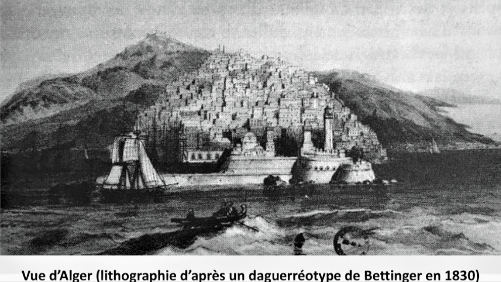- Année 1830 : Vue de la totalité de la minuscule et archaïque ville d’Alger édifiée majoritairement et de manière anarchique par le colonisateur turc durant ses 3 Siècles ( 1515-1830 ) de présence sur une terre désertique où régnaient à l’état endémique, la peste, la variole, le typhus… ;