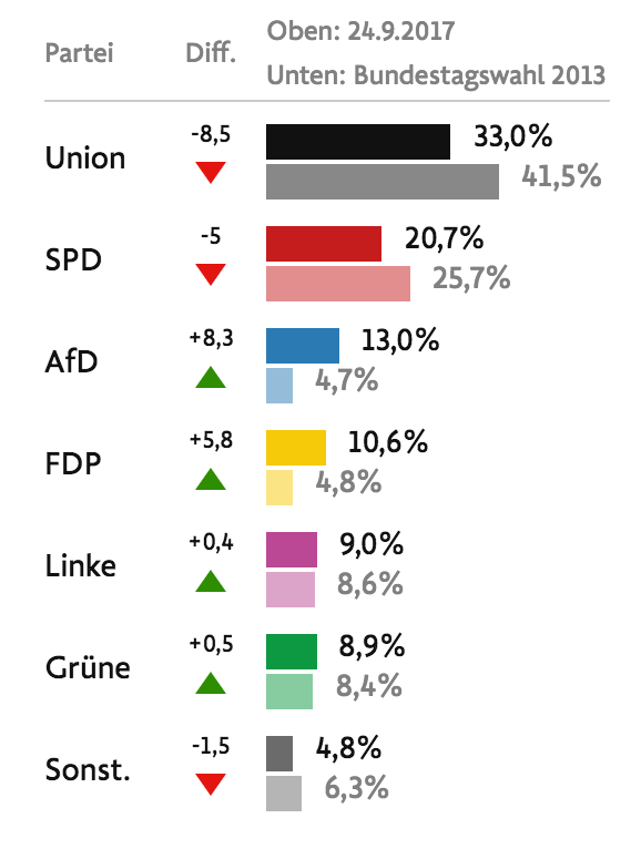 Les résultats reproduits ci-dessus montrent qu’à 21h10 dimanche soir le parti d’Angela Merkel remportait 33% des voix, loin devant ses challengers. Les sociaux-démocrates flirtent avec les 20% des voix. L’Alliance pour l’Allemagne est devenue le troisième parti allemand, avec plus de 13% des suffrages. En quatrième position, on trouve à quasi-égalité autour de 10% les libéraux, les communistes et les verts.