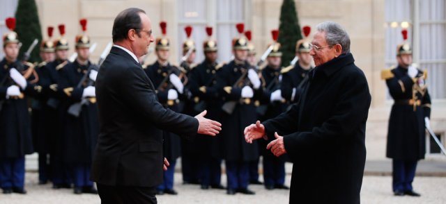 Ne serait-ce que ces derniers huit jours, il aura reçu le Président iranien Rohani auquel les Honneurs seront rendus dans la grande cour des Invalides, là où la Nation rend hommage aux militaires morts au combat, là où il tint cérémonie d’hommage pour les victimes des attentats de Paris et il aura reçu, tant qu’à faire, Raul Castro. Celui-ci aura le privilège de rallumer la flamme sur la tombe du soldat inconnu avant de se voir offrir un dîner d’Etat au palais de l’Elysée, dîner où le tout-Paris des affaires et du show-biz sera convié, de Mélenchon à Laurence Ferrari en passant par Costa-Gavras ( réalisateur de film aussi marquant que l’Aveu ou Z ) et Nathalie Cardone qui chantera son célèbre tube-hommage au Che " Hasta Siempre ".