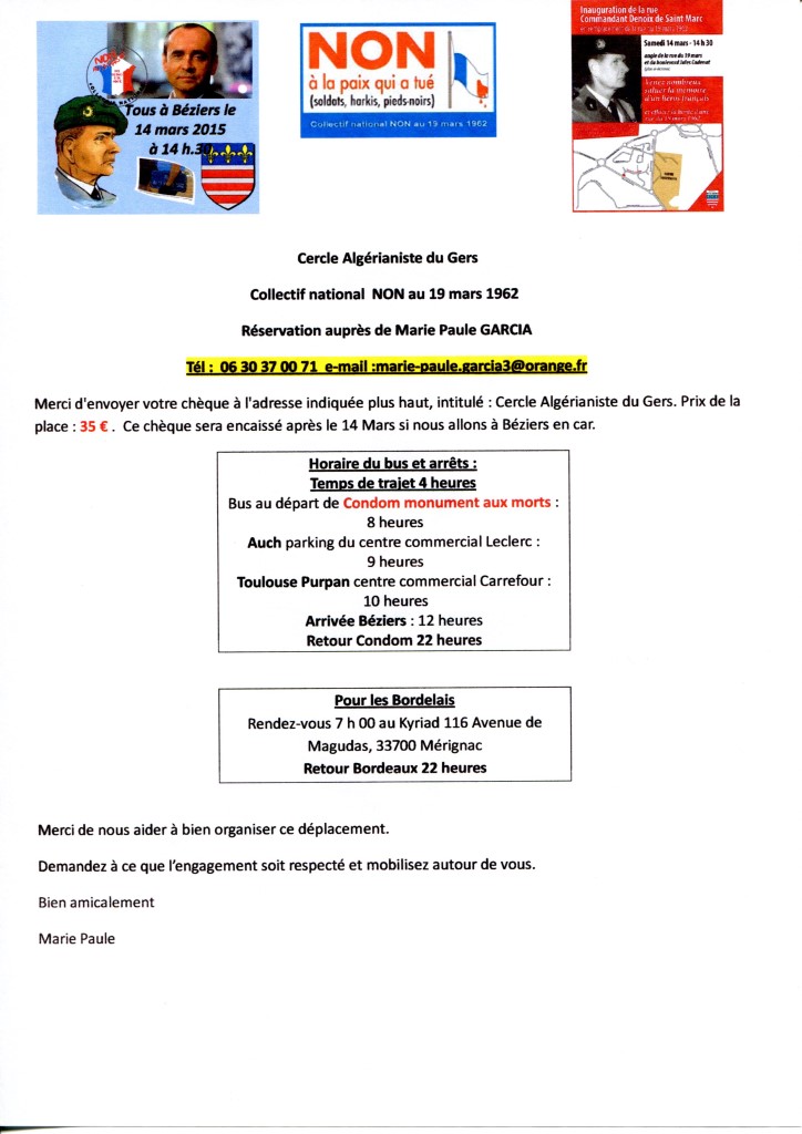 Georges Belmonte propose aux Pieds-Noirs de Gironde qui souhaitent de se joindre à cette manifestation d’organiser :
