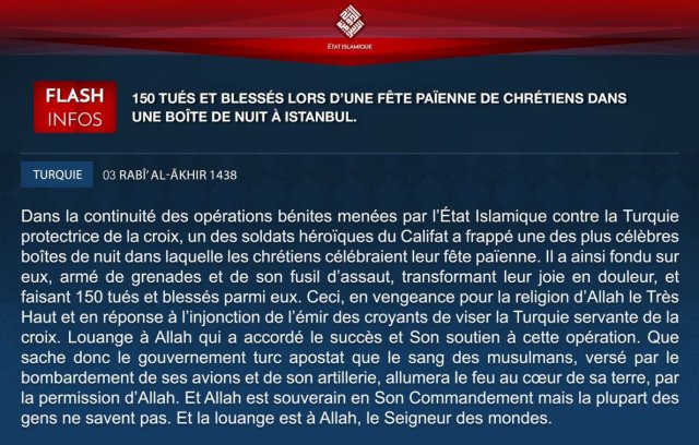 Ci-dessous le communiqué de l’auto-proclamé Etat islamique revendiquant l’attentat commis à Istanbul le 31 décembre dernier :