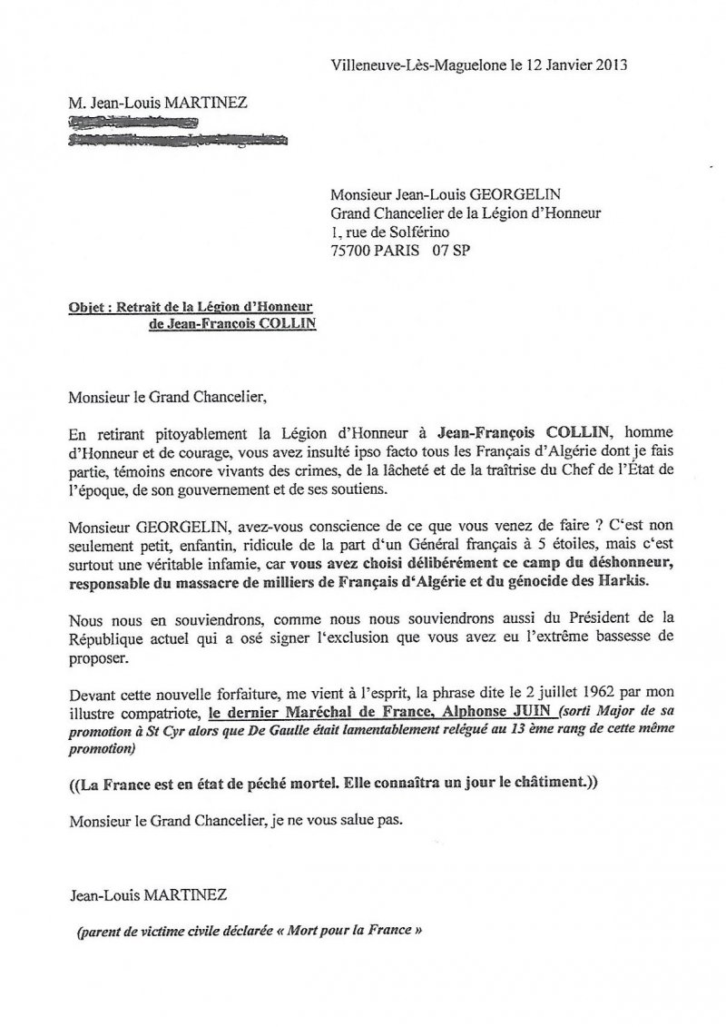 Pour mémoire, JF COLLIN, ancien Président de l’ADIMAD et Officier de Commandos Parachutistes (GPC), avait obtenu cette Légion d’Honneur ainsi que la Croix de la Valeur Militaire, pour avoir été grièvement blessé en ALGÉRIE FRANÇAISE au cours d’un combat contre l’ennemi FLN !!!