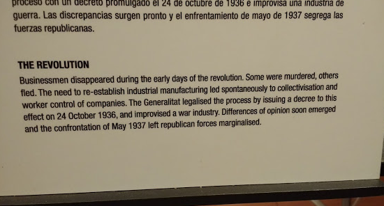 Le musée évoque l’événement en une phrase : « Des différences d’opinion (discrepancias) sont apparues et la confrontation de mai 1937 laissa les forces républicaines marginalisées. » La terreur, les arrestations en masse de gauchistes accusés d’êtres des agents fascistes, et la liquidation de leurs leaders par le NKVD réduites à des divergences… Ah qu’en terme galant ces choses-là sont mises !