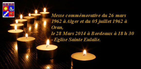 Toujours en mémoire du 26 Mars 1962 et du Génocide du 5 Juillet 1962 à Oran comme tous les ans une commémoration du souvenir a lieu place Raoul Salan à Saint Seurin Sur Isle, Rte de Périgueux devant la stèle Raoul Salan à 11H00 le 26 Mars 2014 suivi d’un repas amical patriotique ADIMAD à 12h30 ou tout le monde peut y participer tel : 06 11 28 55 90, là également à cette commémoration nous vous espérons nombreux.