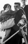 Je remonte sur le pont retrouver la jeune femme avec qui j’allais voyager. Nous retrouvons les enfants qui commencent à jouer ensemble quand une violente explosion secoue le bateau. Tous les passagers étaient tétanisés sans pouvoir faire quoi que ce soit seulement attendre ce qui allait se passer. A ce moment nous avons aperçu Philippe et son copain au pied de la passerelle. Ils avaient réussi à passer les barbelés et nous faisaient des signes d’adieu, ce qui nous a un peu rassurées. Après quelques explosions qui s’éloignaient manifestement, nous nous sommes occupées des enfants et du voyage. J’apprendrai plus tard que c’était l’armée française qui faisait éclater des mines dans la passe pour être sûre qu’il n’y avait pas de pièges inconnus.