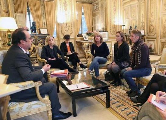Et toute cette histoire, médiatisée de main de maître, est parvenue aux oreilles de Président. Celui-ci que l’on sait fortement chahuté par les sondages, sa gauche, son centre et sa droite a, malgré un agenda que l’on imagine fort chargé, reçu, les filles et avocats de Jacqueline ; caméras et objectifs furent ( naturellement ) conviées ( Gantzer, tu es génial ! ). Objectif de la réunion : que la famille obtienne la grâce de Jacqueline.