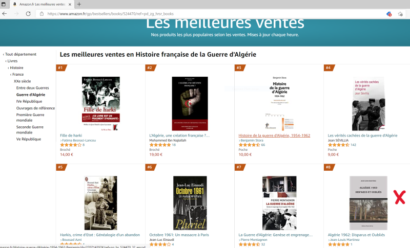 Ce livre a été classé par Amazon, en 8ème position dans les meilleurs ventes en Histoire Française de la Guerre d’Algérie et a obtenu 5 étoiles dans les commentaires (dito pour la FNAC).