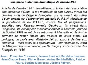 Pièce de théâtre dramatique historique sur la fin de l’Algérie Française. A la fin de l’année 1961, les membres de l’Association Générale des Etudiants d’Oran se trouvent impliqués dans des évènements où s’entremêlent attentats du FLN, réactions de la population et de l’OAS, couvre feu et perquisitions, enquêtes des Renseignements Généraux...