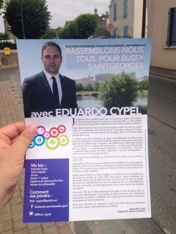 Le député socialiste Rihan-Cypel vient d’annoncer sa candidature et voici, ci-dessus, son premier tract de campagne, couleur bleue dominante, celle généralement employée par des candidats de droite. Vous pouvez vérifier, nulle mention n’est faite d’une éventuelle appartenance politique. Le logo du PS n’apparaît nulle part. Pas une fois le mot " socialiste " est utilisé. Mieux encore, le candidat Rihan-Cypel mentionne que son équipe sera composée de personnes de " tous bords et de toutes sensibilités ".